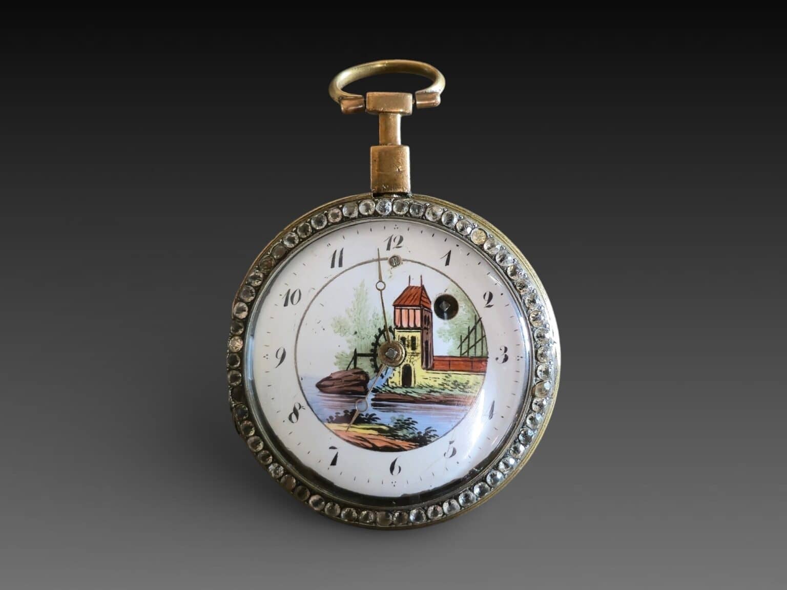 Leton, Montre à gousset, décoré à l'avant d'un paysage avec un moulin, et à l'arrière d'une scène émaillée à décors de deux femmes à coté d'une fontaine